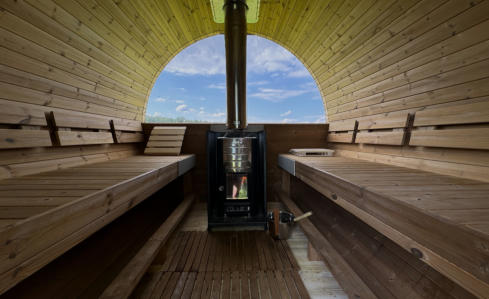 Unser mobiles Sauna-FassFinnische Thermo-Fass-Sauna aus nordischer Fichte mit finnischem Holzofen, 2 Sitzbänken und Nackenstützen, 2 Außensitzen mit Vordach sowie großzügiger Treppe für einen bequemen Einstieg.Für 4 Personen pro Sauna-Gang geeignet, maximal 4 Saunagänge pro Stunde mit unterschiedlichen Gästen möglich.